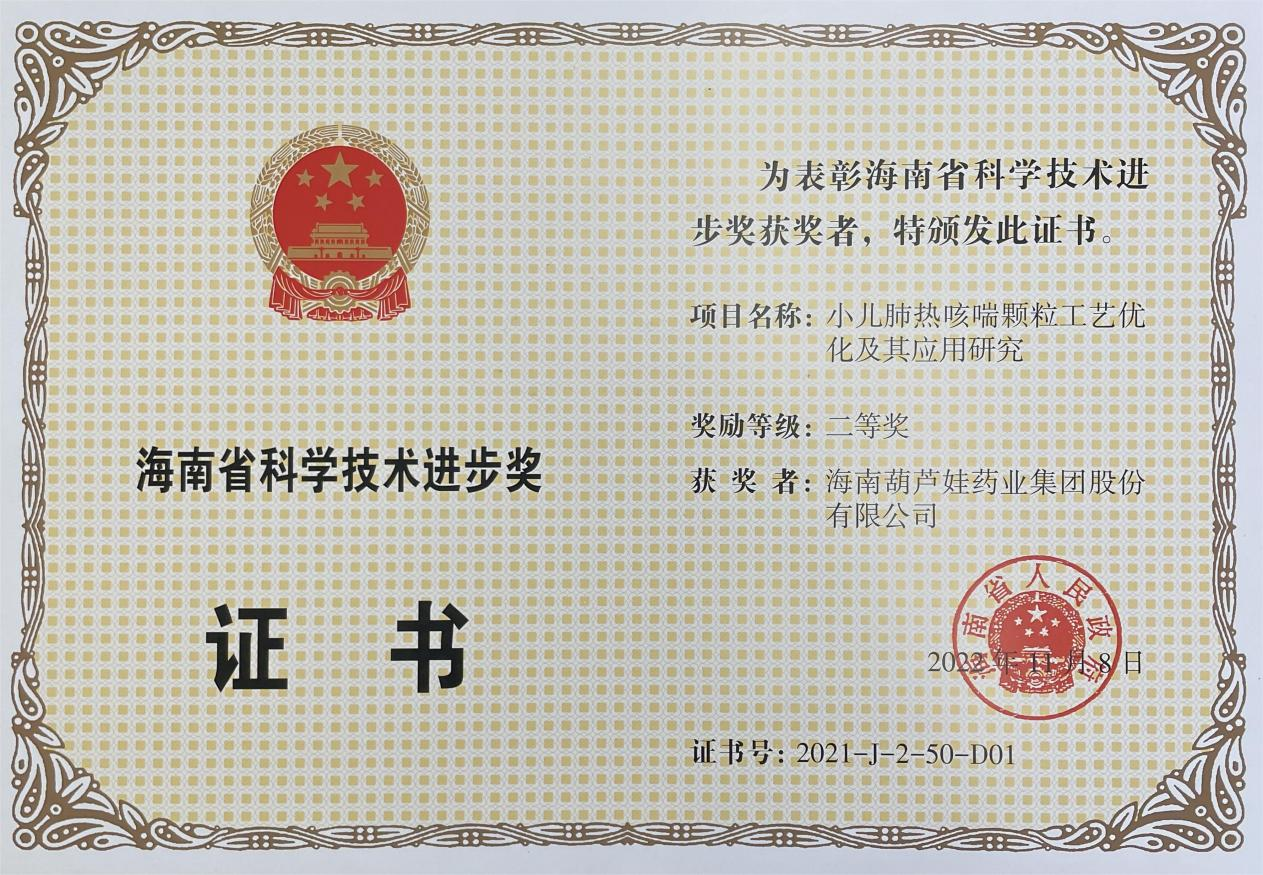 为此,小儿肺热咳喘颗粒的制备方法获得了第二十一届中国专利优秀奖(2019年),专利申请号:ZL201010134951,此次作为专利技术的应用,获得了2021年度海南省科学技术进步奖二等奖。在此之前,Z6·尊龙时凯牌小儿肺热咳喘颗粒还多次被授予“临床价值中成药品牌”、“中国连锁药店最具合作价值单品”,荣登“中国医药品牌榜”。